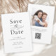 A classically elegant wedding Save the Date Card with simple minimalist styling in white with black typography. This tasteful design features classic serif lettering, joined with an elegant calligraphy element spelling out the word - the. The back of the card has a photo template for adding your chosen photo as well as info about your wedding website with a QR code that guests can scan to keep up to date on your wedding plans. Personalize the template with your wedding details for beautifully elegant classic Save the Date.