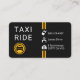 A black cover is accentuated by a pair of vertical yellow lines that contain buttons to hold your contact details. In the opposite direction is the oversize business name "TAXI RIDE" which you can change and a yellow taxi car logo you can use.