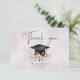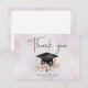 A clean and modern graduation party thank you card. The front features an elegant abstract watercolor background. Soft pale purple and blush pink tones add a gentle, feminine touch, creating a polished and stylish card for show you appreciation to celebrating this special milestone with you. A beautiful watercolor illustration of a student cap with gold tassel with pretty pink flowers and green leaves.