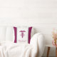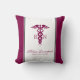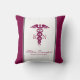 Ein weißes Kissen mit einem roten, stylischen Kadukus-Symbol mit den Buchstaben R N auf beiden Seiten. Burgund grenzt an. Personalisiert mit Ihrem Namen und Titel.