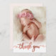 Moderne elegante Kalligrafie Rose Gold Script Foto Neugeborene Baby Girl Dankeschön Karte. Ein wunderschöner "Dankeschön"-Text in einem handgeschriebenen Kalligrafie-Schwanz-Schriftbild in faux rosa Goldfolie (oder rot-rosa Folie). Auf der Rückseite vorgefertigte persönliche Nachricht auf rot-rosa Hintergrund. Ideal für kleine Mädchen. Einfach mit Ihrem Baby Foto und Details personalisieren.