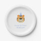 Einfache und moderne Geburtstagsparty-Teller mit einer Aquarellillustrierung eines Tigergesichts mit einem blauen Hut aus Party. Personalisieren Sie mit dem Namen Ihres Sohnes in hellblau.