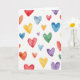This greeting card shows watercolor hearts scattered across a white background in a loose, easy pattern. The hearts come in many sizes, from small accents to larger ones that catch your eye as you look around. Colors move through reds, oranges, yellows, greens, blues, and purples, with some hearts darker and others light and see-through. You can see the paint softly bleeding at the edges, which gives each heart a gentle, washed look. There aren’t any people or objects—just a field of hearts that feels like a simple reminder that love can show up in lots of different ways. There’s no text on the front, so the design leaves room for your own words inside. It feels meaningful to give because it works for romance or close friendship without being too specific 🥰❤️.