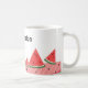 Frische, reife Wassermelonen mit rosafarbenem Fleisch, schwarzen Samen und dunkelgrünen Rinnen auf einem weichen rosa Design am Boden. Das Wort "Wassermelone" kann auf Wunsch geändert werden.