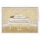 Ein Weiß- und Goldklavier trägt den Antrag "singen bitte an unserer Hochzeit", angegrenzt durch zwei Barock-ähnliche Stühle in einer eleganten Einstellung, die einen blassen Damasthintergrund, einen hellen hölzernen Boden und einen geschnitzten Torbogen kennzeichnet.