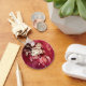 A delicate single rose and buds are intricately detailed in the center, set against a vibrant, swirling red background of pink. The color contrast highlights the floral beauty while creating a sense of depth and richness.