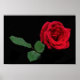 Dieses elegante Poster besticht durch eine exquisite Single-Scharlach-rote Rose mit drei grünen Blätter auf schwarzem Hintergrund.