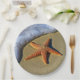 Eine beeindruckende Strandfotografie, ein hellorangefarbener Seestern am Ufer, der von einer sanften Welle bedeckt werden soll.