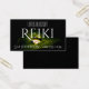 Auf dieser modernen Reiki-Visitenkarte liegt ein Single Wasser auf einem grünen Blatt.