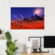 Eine Weltraumszene eines frühen Nachmittags auf einem weit entfernten roten Planeten. Die Oberfläche der Berge ist schneebedeckt mit einer dünnen Schicht roten Eisenoxids, oder einfach staubigen Rost. Die rot-orangefarbene Oberfläche und der bläuliche Himmel erzeugen eine fast illustre Umgebungsbeleuchtung. In der Nähe des Horizonts entfaltet sich langsam ein riesiger ringförmiger Planet und sein Mond.