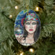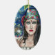 Ein schönes dunkles behaartes Sinti und Roma mit den grünen Augen, die einen Kristallball umgeben durch Blätter und einen Nachtzeithimmel halten.