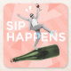 A fun and modern “Sip Happens” coaster featuring a carefree character balancing on a champagne bottle with a wine glass in hand. A playful addition to any home bar or entertaining space.