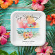 Die Teller aus tropischen Themenpapieren sind mit einem Sonnenuntergang in Aquarelltönen, Cocktails, Hibiskus-Blume und Palmen-Blätter mit einer "Sip Sip Hooray"-Beschriftung ausgestattet. Sie können die Namen und Details personalisieren, sodass diese gut funktionieren, egal ob Sie eine Hochzeitsdusche, eine Verlobungsfeier oder ein Brautparty haben (Sie haben die Idee!).