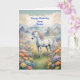 Wünsche für einen magischen Geburtstag. Wünschen Sie Ihrer Schwester einen glücklichen einsamen Geburtstag! Ein traumhaftes Bild eines weißen Einhorns mit einer Regenbogenhaut in einem Feld von Blume stehend. Im Hintergrund sind majestätische Berge. Die perfekte Karte, um den Lieben magische und mystische Einhörner zu geben.