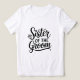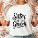 Show off your special role in the upcoming wedding with this elegant 'Sister of the Groom' T-shirt! Featuring a beautiful black script font with a cute heart detail and a sparkling diamond icon, this design is perfect for the bridal shower, bachelorette party, or the morning of the big day. Please note: This is a high-quality printed graphic on a soft and comfortable women's tee. A wonderful gift for the groom's sister to wear while celebrating with the family. Stylish, classic, and perfect for all those pre-wedding photos!