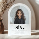 Eine einfache 6. Geburtstagsveranstaltung mit einem eigenen Foto in Bogenform und den Worten "sechs" darunter. In diesem Design können Sie schnell und einfach Ihr eigenes Foto hinzufügen.