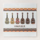 Puzzle mit einem Muster von sechs Ukulelen mit einem schönen geometrischen, ethnischen Rahmen.