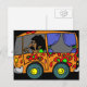 In den 60er Jahren entstand ein orangefarbener Van mit typischen Logos aus den 60er Jahren, der von einem Mann mit langen Haaren angetrieben wurde. Farbenfroh und lustig.