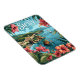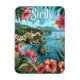 Eine lebendige und nostalgische Darstellung eines tropischen Strandes in Sizilien, die die atemberaubende Schönheit der Küste der Insel zeigt. Der goldene Sand, das klare türkisfarbene Wasser und die üppigen Palmen vor dem Hintergrund einer ruhigen, mediterranen Landschaft zeichnen das Hotel aus. Das Vintage Kunstwerk erinnert an den entspannenden und exotischen Reiz der tropischen Strände Siziliens und lädt die Besucher ein, die sonnenverwöhnte Küste und das ruhige Ambiente zu erleben.