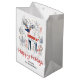 Skandinavische Volkskunst Hirsch Weihnachtsmittel Geschenktasche. Es ist mit einem Reh und stilisierten Blüten Stiele in rot und blau und der Text "Happy Holidays".