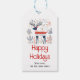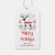 Skandinavische Volkskunst Stil Hirsch Weihnachtsgeschenk Tag. Es ist mit einem Reh und stilisierten Blüten Stiele in rot und blau und der Text "Happy Holidays". Die Abdeckung wurde unter Verwendung einiger Elemente von Freepik.com entworfen