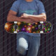 Skateboard in farbiger Sternexplosion grafisch gedruckt. Kaufen Sie, wie es ist oder anpassen Sie dieses Objekt nach Ihren Wünschen.