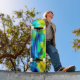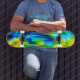Dieses hochwertige Skateboard wird mit einem abstrakten Kunstmuster in Blau, Grün und Gelb dargestellt. Kaufen Sie, wie es ist oder anpassen Sie dieses Objekt nach Ihren Wünschen. Börsenbild 123freevectors.com