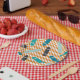 Skateboard Let's Kick It, Geburtstagsparty Teller mit orangefarbenen Karo und Skateboards.