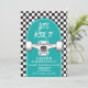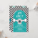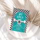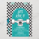 Skateboard Let's Kick It, Birthday einladen mit schwarzem Karo und blauem Skateboard.