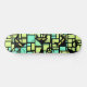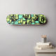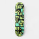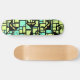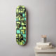 Schwarze Katzen Skateboard mit grünem und gelbem Muster Hintergrund.