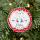 Datierte u. personalisierte niedliche Paare des Eis-Skate Weihnachtsverzierungs-Sets auf einem roten u. weißen Schneeflockemusterhintergrund. Ein, um zu kommen jahrelang gehütet zu werden Wunder-Weihnachtsgeschenk sure.