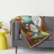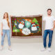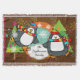 Die schöne Weihnachtsdecke mit zwei zauberhaften Pinguinen in eisgestreiften Skaten, gestreiften Schals, Winterhütten und zwei geschmückten Weihnachtsbäumen auf braunem Hintergrund, farbenfrohen Schneeflocken, einem orangefarbenen Ring mit weißen Schneeflocken und einem Zentrum von Aquablau mit kleinen weißen Polka-Punkten. Sie können diesen festlichen Urlaubsprint ganz einfach mit Ihrem Familiennamen anpassen!