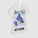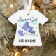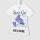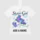Unsere Skater-Mädchenentwurf T - Shirts, Tassen, Taschen, Karten, Kissen, Wanduhren, Andenken, Hoodies und andere Skatenthemaeinzelteile kennzeichnet ein Paar Blau- und Lavendel-Skate und Handschuhe auf einer Schnur, die durch Lose winterliche Schneeflocken und Text, der, umgeben wird Skater-Mädchen liest!