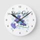 Unsere Skater-Mädchenentwurf T - Shirts, Tassen, Taschen, Karten, Kissen, Wanduhren, Andenken, Hoodies und andere Skatenthemaeinzelteile kennzeichnet ein Paar Blau- und Lavendel-Skate und Handschuhe auf einer Schnur, die durch Lose winterliche Schneeflocken und Text, der, umgeben wird Skater-Mädchen liest!