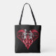 Diese Tasche enthält ein Skelettpaar in der Liebe vor einem Hintergrund eines strahlenden gotischen Herzens, das eine Aura ausstrahlt, die das Wesen der Hingabe erobert. Nicht nur diese Totentasche bietet ein visuelles Erlebnis, sondern auch praktische Funktionalität. Das geräumige Interieur des Hauses bietet Platz für alle wesentlichen Elemente und eignet sich somit ideal für den täglichen Gebrauch. Ermutigen Sie den Reiz der ewigen Liebe, die für immer im Reich des Übernatürlichen gebunden ist.