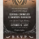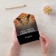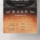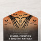 Halloween goth all in one wedding invitation in distressed black and orange with bats, spiderwebs and skeleton hands forming a heart around your initial.