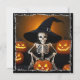 Creepy Halloween-Party Einladungen. Cremefarbenes Skelett in Hexenhut mit Jack-o-Laternen.