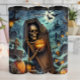 Diese unheimliche Halloween-Illustration zeigt ein lächelndes Skelett, das aus einem hölzernen Sarg in einem spötlichen Friedhof unter Vollmond und einem bewölkten Nachthimmel hervorgeht. Fledermäuse fliegen über dem Kopf, glühende Jack-o'-Laternen und Grabsteine sind verstreut, was eine klassische Spuk Szene schafft.