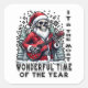 Dieser Aufkleber zeigt ein Skelett, das einen Weihnachtsmannanzug und -hut trägt und eine rote E-Gitarre spielt. Das Design ist in einer schneebedeckten Landschaft mit stilisierten Kiefern und sternähnlichen Funken gesetzt. Der Text lautet: "ES IST DIE WUNDERBARSTE ZEIT DES JAHRES". Das Design könnte aufgrund der hohen Detailtreue und der dreidimensionalen Textur im Kunstwerk echt aussehen.