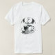 Dieser weiße T - Shirt zeigt ein schwarz-weißes Skelett, das in einer dampfenden Kaffeetasse auf einer Untertasse sitzt. Hinter der Tasse steht ein großer Mond und ein silberner Wald. Das Design ist etwas surreal und makabre, aber skurril.