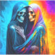 LGBTQIA+ Zwei Skelette, die unter einer Decke mit Regenbogenuntergrund kuscheln.