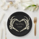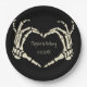 Fügen Sie Ihrer Hochzeit eine gruselige, personalisierte Touch mit diesen Tellern hinzu. Diese Teller sind schwarz und zeigen eine Darstellung der Skeletthand in einer Herzform, die die Namen der Braut und des Bräutigams und das Hochzeitdatum umrahmt. Die Grafik und der Text sind in Creme oder Elfenbeinfarbe. Der makabre Stil ist ideal für Hochzeiten im Oktober oder für Veranstaltungen mit einem Gothic-Thema.