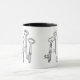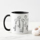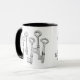 Kaffeebeutel mit handgezeichnet Stift und Tinte, gezeichnet von einer Reihe Vintager antiker Skelettschlüssel. Skeletttasten werden auf beiden Seiten der Tasse gedruckt. Kunstwerk: Stift und Tinte auf Papier. Copyright Dominic A. White.