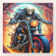 Ein Skelett, das durch die Feuerhöhle fährt. in den verzauberten Tunnel eintritt.Er hat ein hochgezogenes Fahrrad.Er hat eine schwarze Lederhose und Motorradstiefel und eine schwarze Lederjacke mit Knochenemblem wie ein Design auf dem Motorradoutfit.Er strahlt aus seiner Umgebung .Der Mond kommt hinter ihm hervor. Haze aus dem Feuer um ihn herum auf und in die dunkle Nacht fährt er mit den Sternen oben weg.