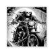 Ein Skelett, das durch die Feuerhöhle fährt. in den verzauberten Tunnel eintritt.Er hat ein hochgezogenes Fahrrad.Er hat eine schwarze Lederhose und Motorradstiefel und eine schwarze Lederjacke mit Knochenemblem wie ein Design auf dem Motorradoutfit.Er strahlt aus seiner Umgebung .Der Mond kommt hinter ihm hervor. Haze aus dem Feuer um ihn herum auf und in die dunkle Nacht fährt er mit den Sternen oben weg.