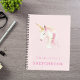 Eine mädchenhafte Skizze für die Schule oder ihre Kreativität. Ein weicher, rosafarbener Hintergrund, mit einem niedlich rosa, wasserfarbenen Einhorn dekoriert. Personalisieren und einen Namen hinzufügen.