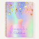 Ein angesagter holografischer Hintergrund mit Einhorn- und Regenbogenpastellfarben in Rosa, lila, Minzgrün. Dekoriert mit tropfenden Sternen und einem Regenbogenfarben Einhorn. Personalisieren und einen Namen hinzufügen. Der Titel: Sketchbook ist mit einem angesagten, handgeschriebenen Skript geschrieben. Benutzen Sie es als Skizze, zeichnend, Notizen machen, handwerkliche Ideen, Schule, Zuhause-Arbeit.