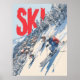 Eine aufregende Winterlandschaft zeigt Skifahrer, die einen steilen, schneebedeckten Berghang über einem farbenfrohen alpinen Dorf hinunterfahren. Knackiger weißer Schnee kontrastiert mit tiefblauen Schatten und hoch aufragenden bereiften Bäumen, während kühne rote Schrift der Komposition dynamische Energie verleiht. Der dramatische Winkel und das Gefühl der Bewegung rufen Geschwindigkeit, Freiheit und den Nervenkitzel des Abfahrtslaufens in einer atemberaubenden Bergkulisse hervor.