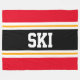 Dieses sportliche, sportliche Design zeichnet sich durch feinen SKI-Text in einem farblich hervorgehobenen breiten schwarzen Streifen mit doppelweißen und gelben Rennstreifen gegen leuchtend rote Außenstreifen aus. Der Text kann personalisiert sein.