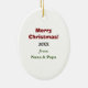 Hier ist ein bezaubernder personalisierter Weihnachtsschmuck für ein kleines Kind, besonders für einen Jungen. Die Vorderseite zeigt ein niedliches Pinguin-Cartoon-Bild. Der Pinguin trägt einen orangefarbenen Schal und blaue Brillen und Skis, während die Schneeflocken um ihn herabdriften. Über dem Bild befindet sich ein weißes, blau gesäumtes Scrollbanner, das Ihren eigenen Text in schwarz zeigt. Auf der Rückseite des Ornaments befinden sich drei zusätzliche Textfelder, die Sie anpassen können. Ein perfekter Urlaub für jedes Kind.